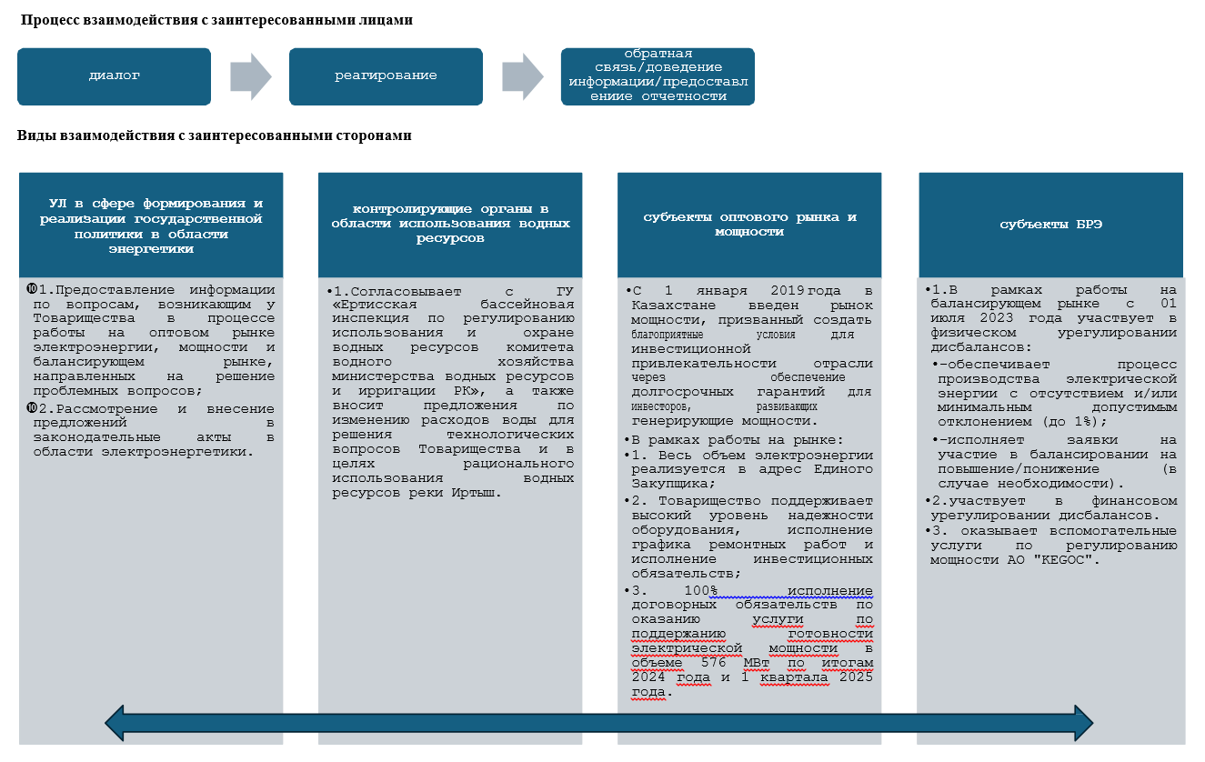 - Согласовывает с ГУ «Ертисская бассейновая инспекция по регулированию использования и охране водных ресурсов комитета водного хозяйства министерства водных ресурсов и ирригации РК», а также вносит предложения по изменению расходов воды в створе станции для решения технологических вопросов Товарищества и в целях рационального использования водных ресурсов реки Иртыш.